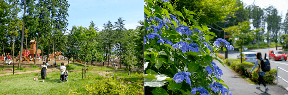 グランベリーモールと西隣の鶴間公園(左)の北側を通る新設道路「南町田グランベリーウォーク」(右)。この日は至る所に紫陽花が咲いていた