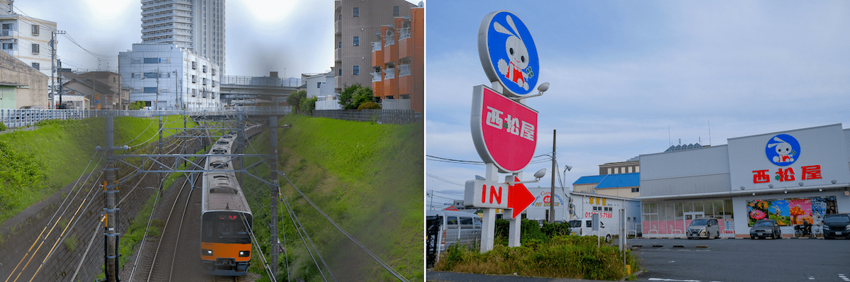 東急田園都市線を跨ぐ「小鶴橋」は電車観察にぴったり(左)。「西松屋 南町田店」(右)が徒歩4分の距離にあるのも子育て世帯には嬉しいポイント