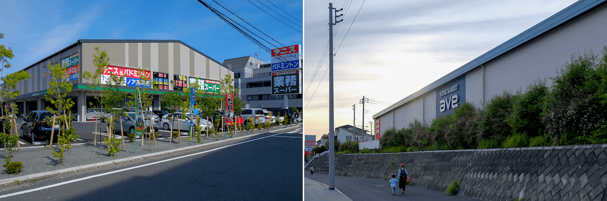 最寄りのスーパーは徒歩3分の「業務スーパー TAKENOKO 南町田店」(左)。ave(エイビイ)南町田店(右)までは徒歩9分