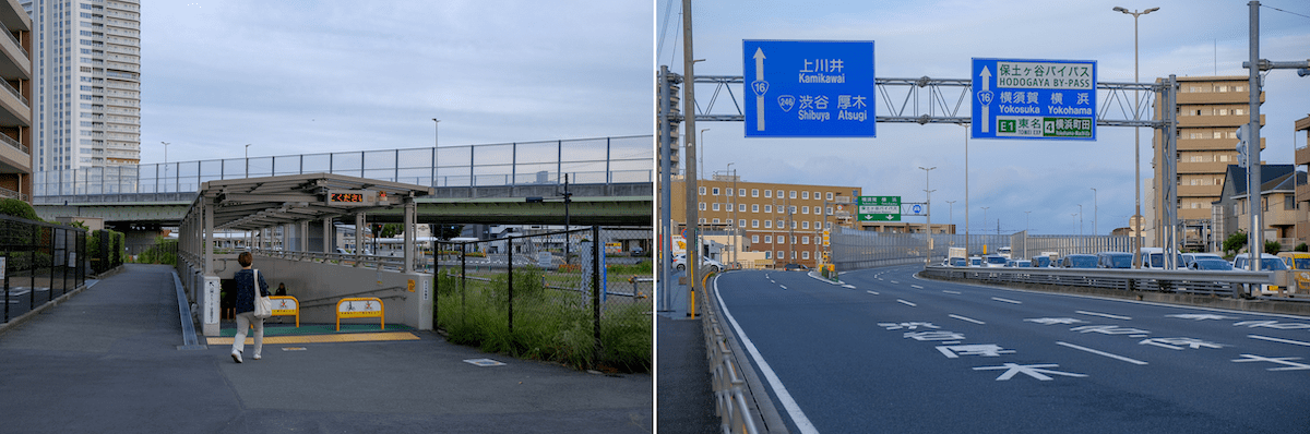 地下道の出入り口(左)と保土ヶ谷バイパスの町田立体ランプ出入り口(右)