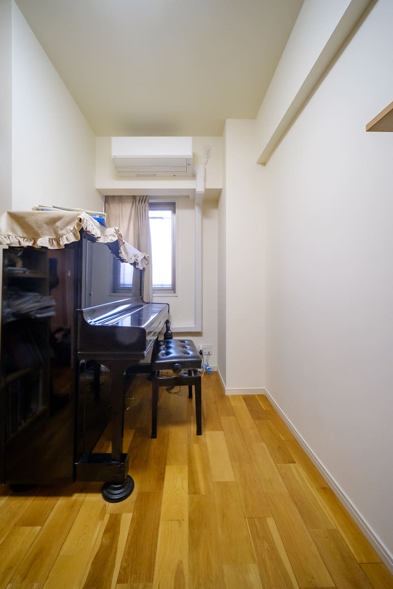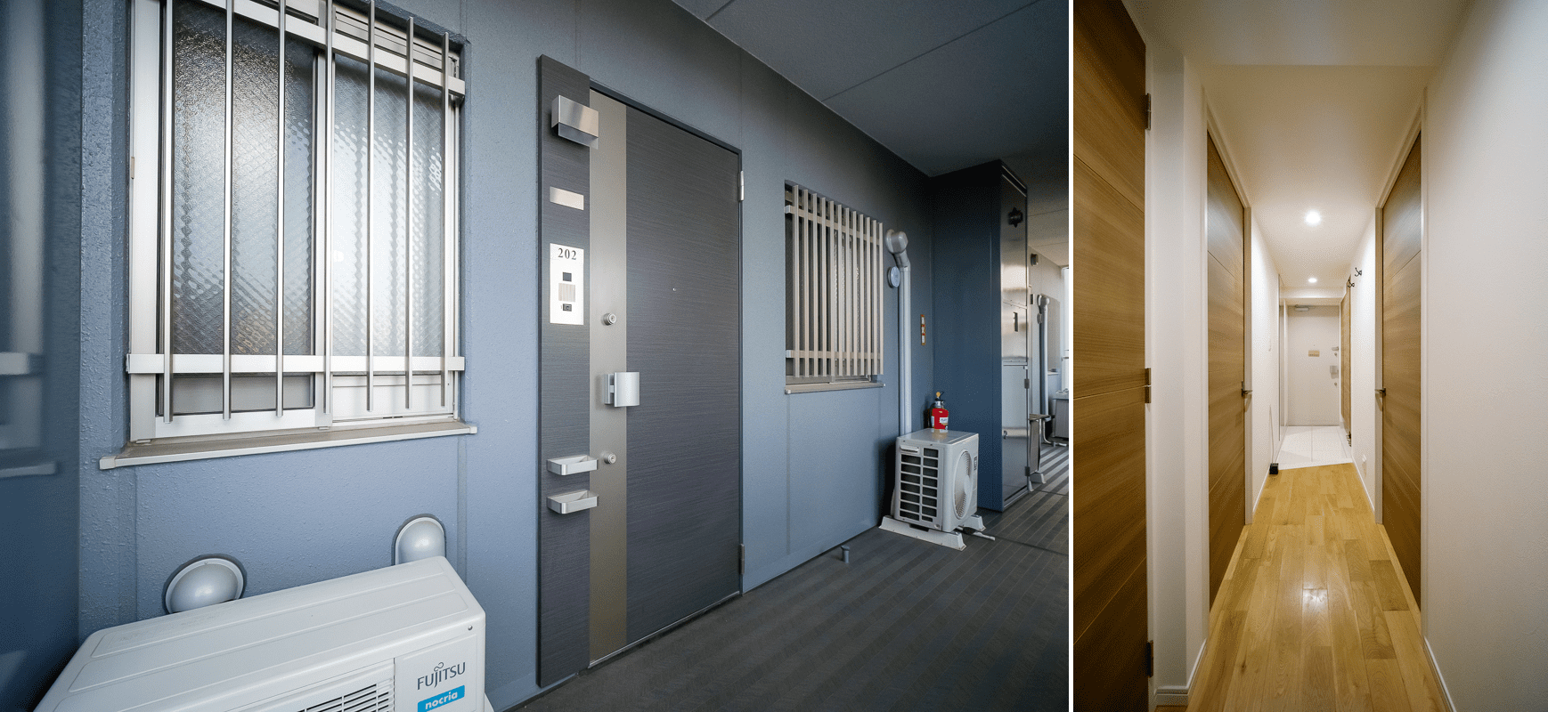 玄関ドアの左右には個室の窓(左)。室内側は白壁で、明るく温かな印象をうける