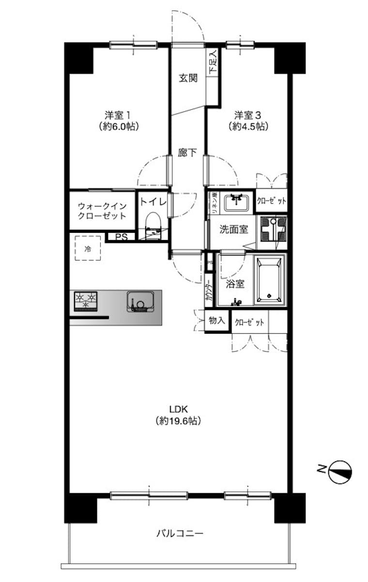 専有面積は約66㎡。約19.6帖の広々リビングが特徴の2LDK