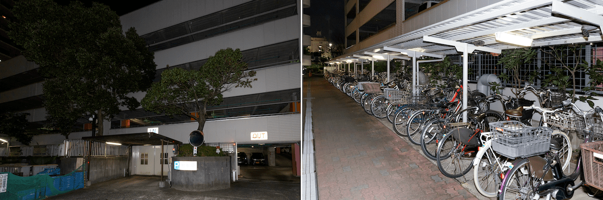 敷地内に自走式の立体駐車場を完備。駐輪場は複数箇所あり、収容台数も多い