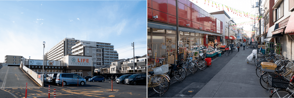 歩いて5分のいなげやが一番近いスーパーでしょうか。徒歩10分のところにもライフがありますし、川崎駅や鶴見駅まで訪れなくても日々の買い物は十分行うことができます。また京町商店街という昔ながらの商店街があるので、節約したいときにはよく訪れていました。