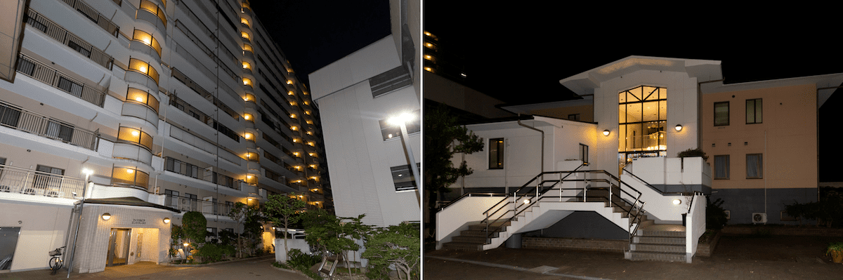 棟ごとにエントランスが分かれているタイプ。共有施設のアリーナでは集会や音楽会などの催し物も行われる