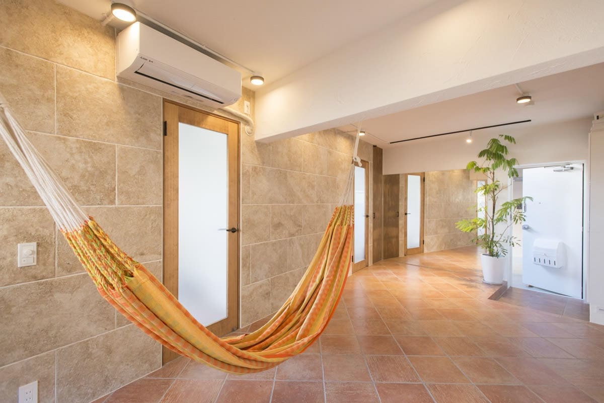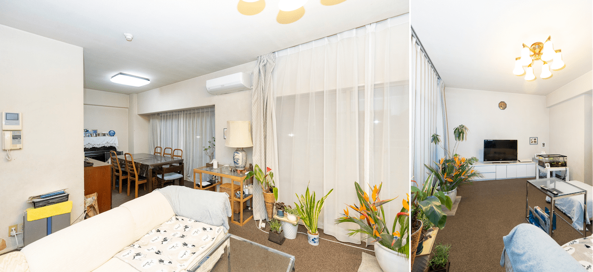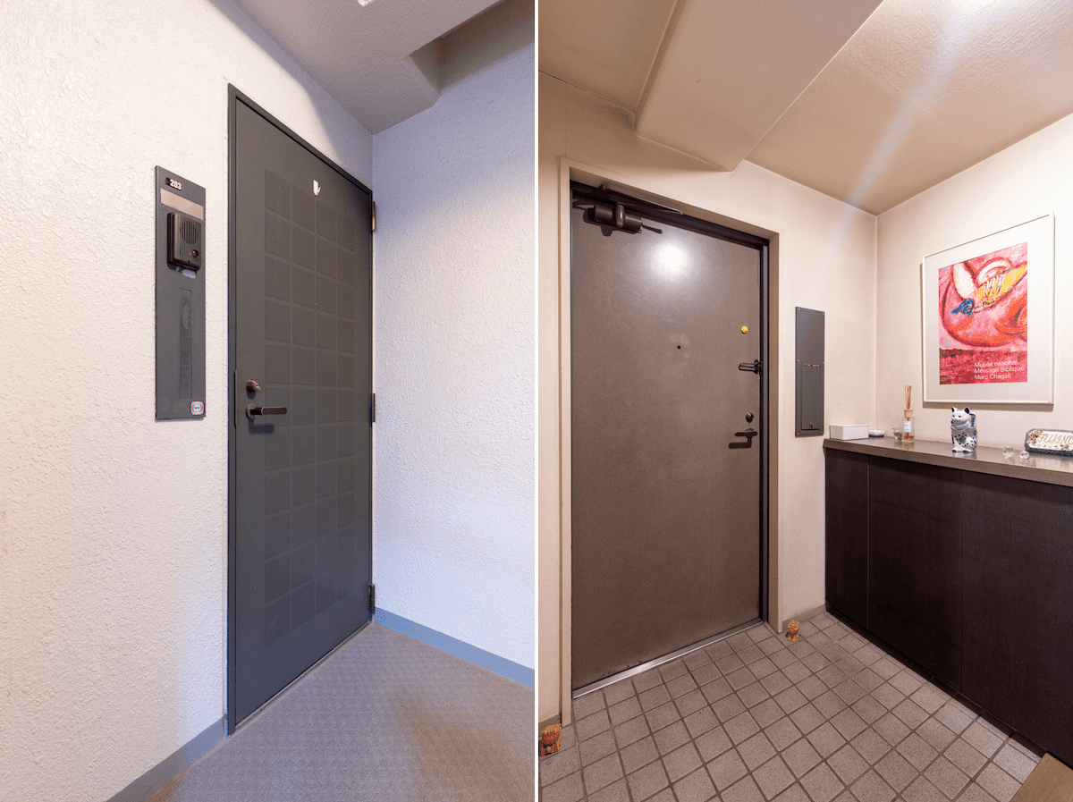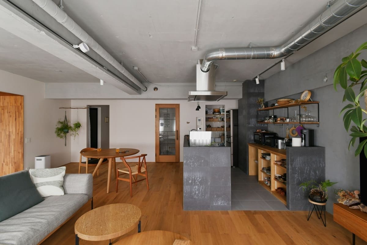 玄関を入って左右に空間が分かれる物件は、リノベで正面の床材を大胆な土間仕上げにすると、部屋ごとのゾーニングができ、スイッチの切り替えができますよ。