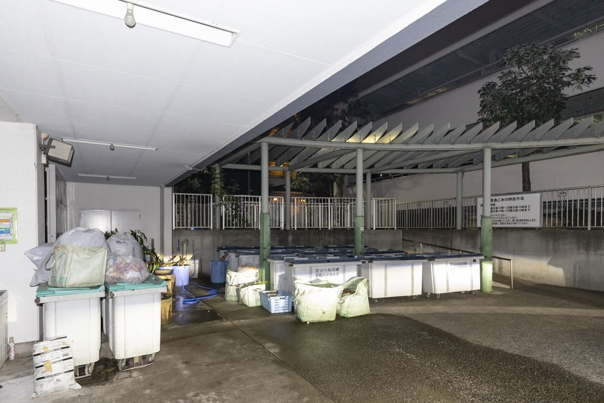 広大な敷地内のゴミ置き場。きれいに整頓されている