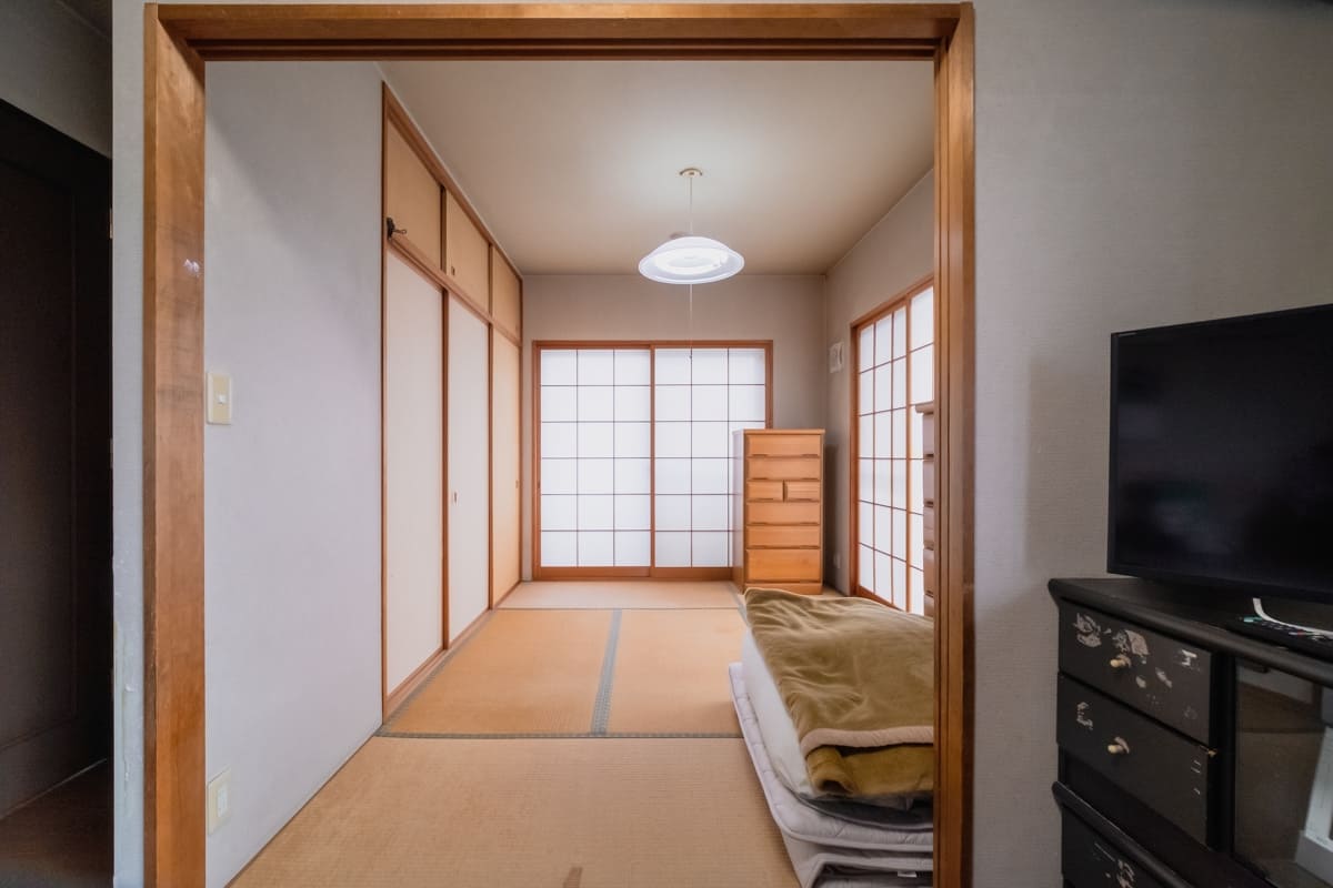 リビング隣の和室。障子はアクリル素材で張り替え不要。障子の向こうはベランダ
