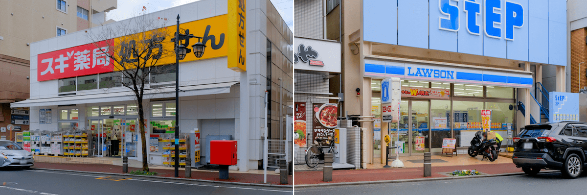市が尾駅東口の「スギドラッグ市が尾店」(左)と「ローソン 青葉市ケ尾駅南店」(右)