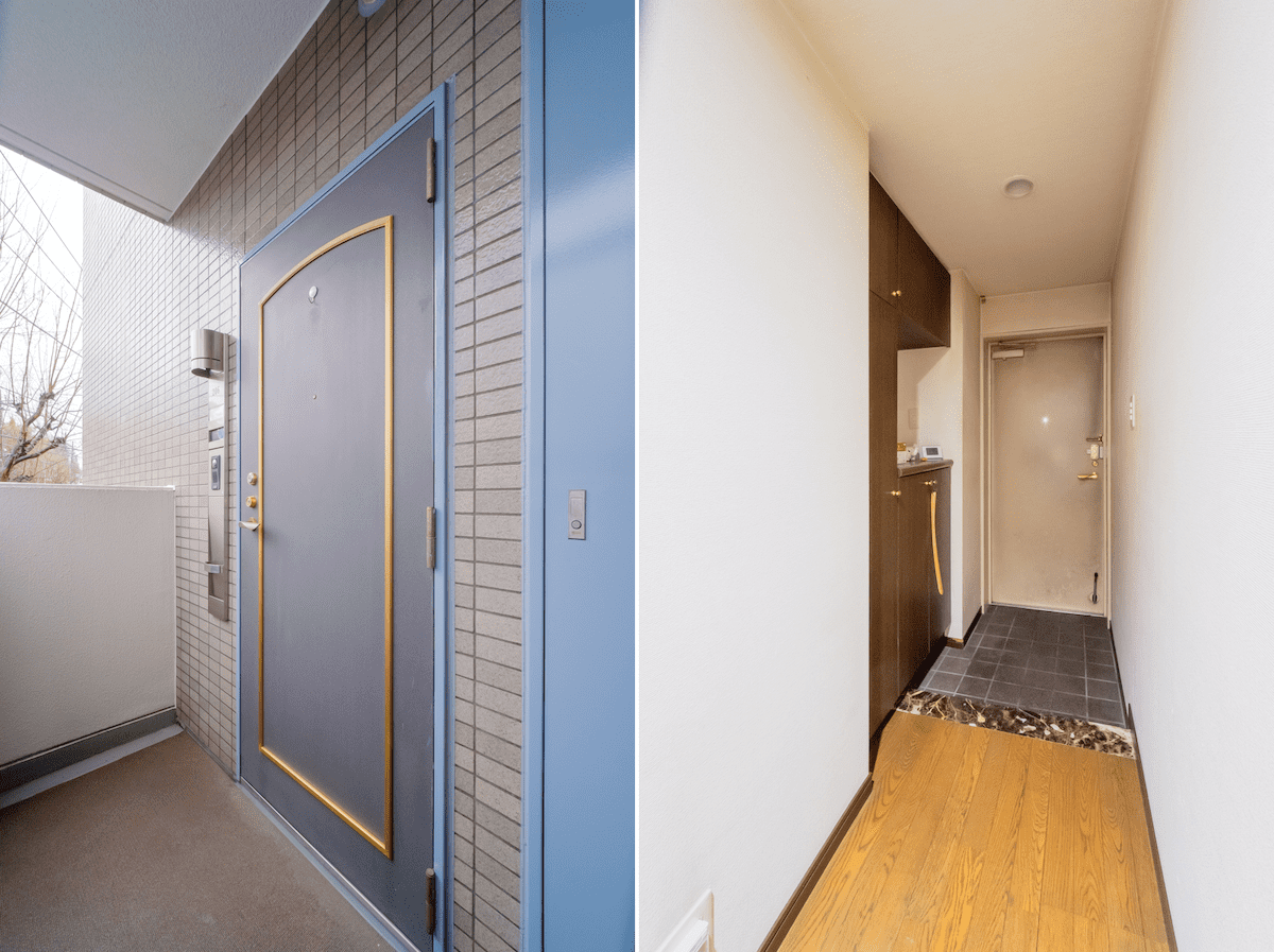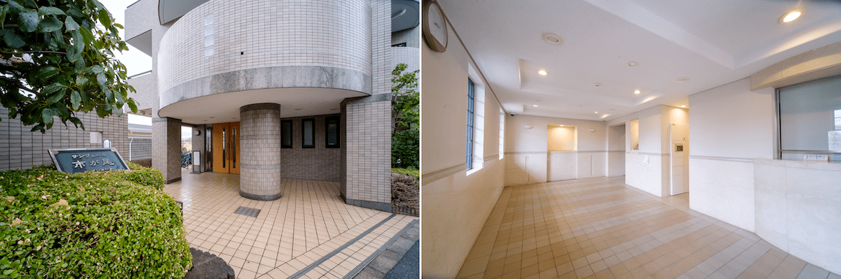 2022年に大規模修繕済みのため、外壁や共用部分はとてもきれい。玄関内側はリノベのしがいがあるコンパクトなつくり