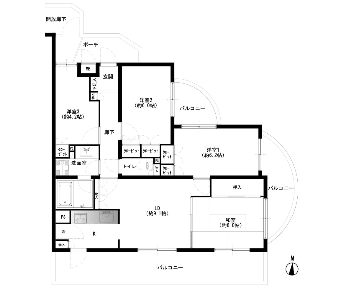 76平米、4LDKの広々とした間取り。3つのバルコニーで日当たり良好