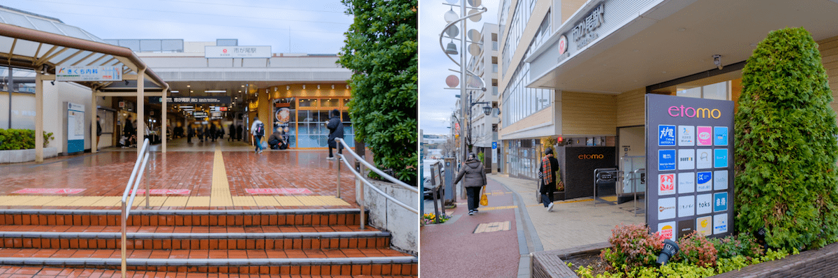 市が尾駅西口(左)と東口(右)。駅直結のショッピングセンター「etomo」には東急ストアや100円ショップ、外食・中食店等が入居している