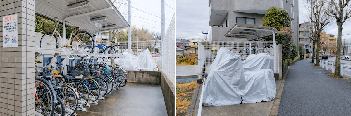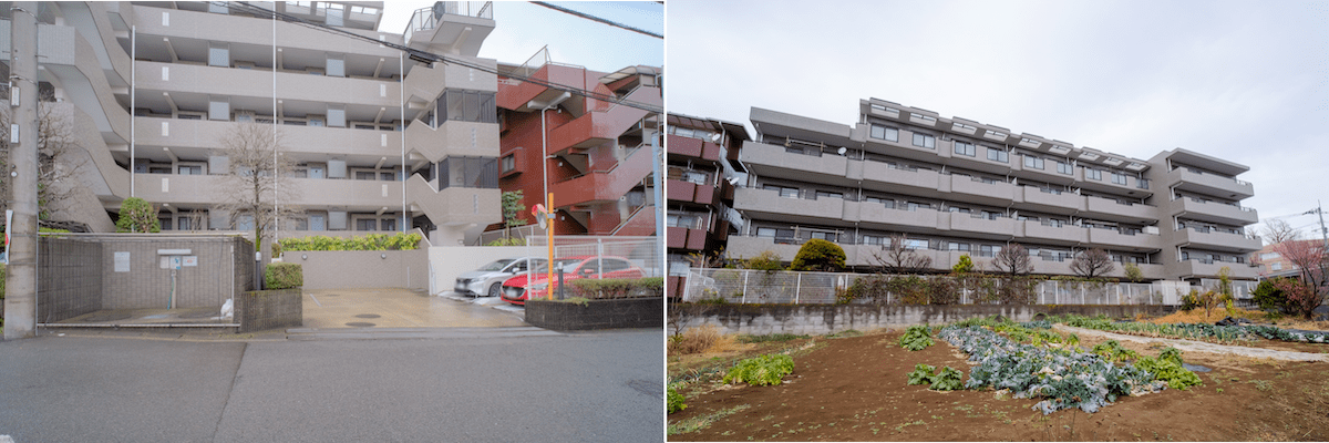 駐車場とごみ置き場(左)。マンション南側は畑になっている(右)