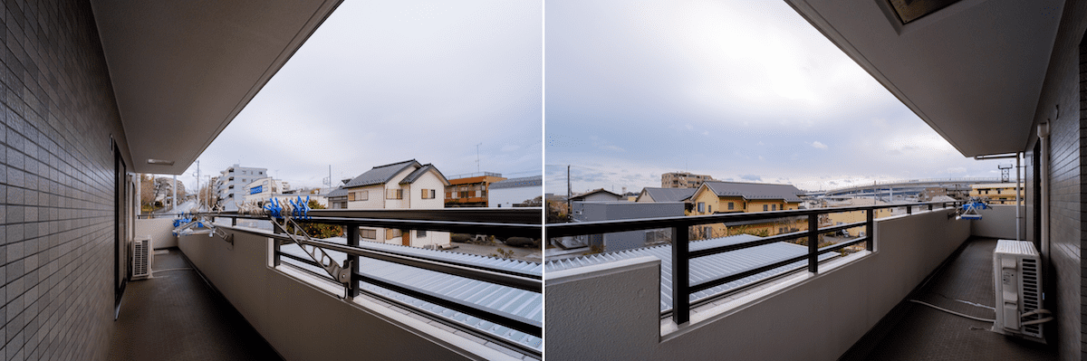 リビング側のバルコニー。隣の居室から独立しているため、気兼ねなく伸び伸びできる。南西の方角には東名道横浜青葉JCT