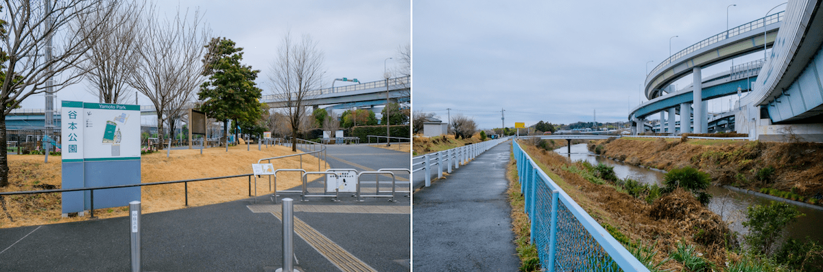 谷本公園から鶴見川沿いにサイクリングロードを下流へたどれば、日産スタジアムや新横浜駅への中距離サイクリングを楽しめる