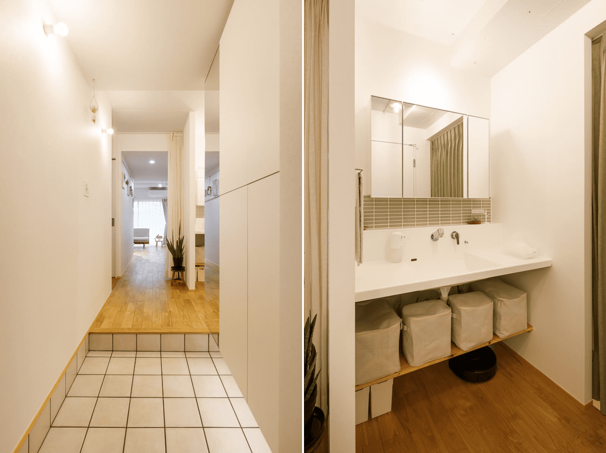 玄関の間口に制限がある場合は、極力間取りを取り払うことで明るい玄関が実現。玄関付近に洗面台を設ければ、帰宅後すぐに手洗いができて衛生的にも気持ちがいいです