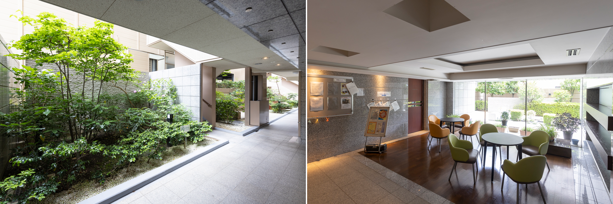植栽が豊かな施設内。共有の憩いの場からもグリーンが見える