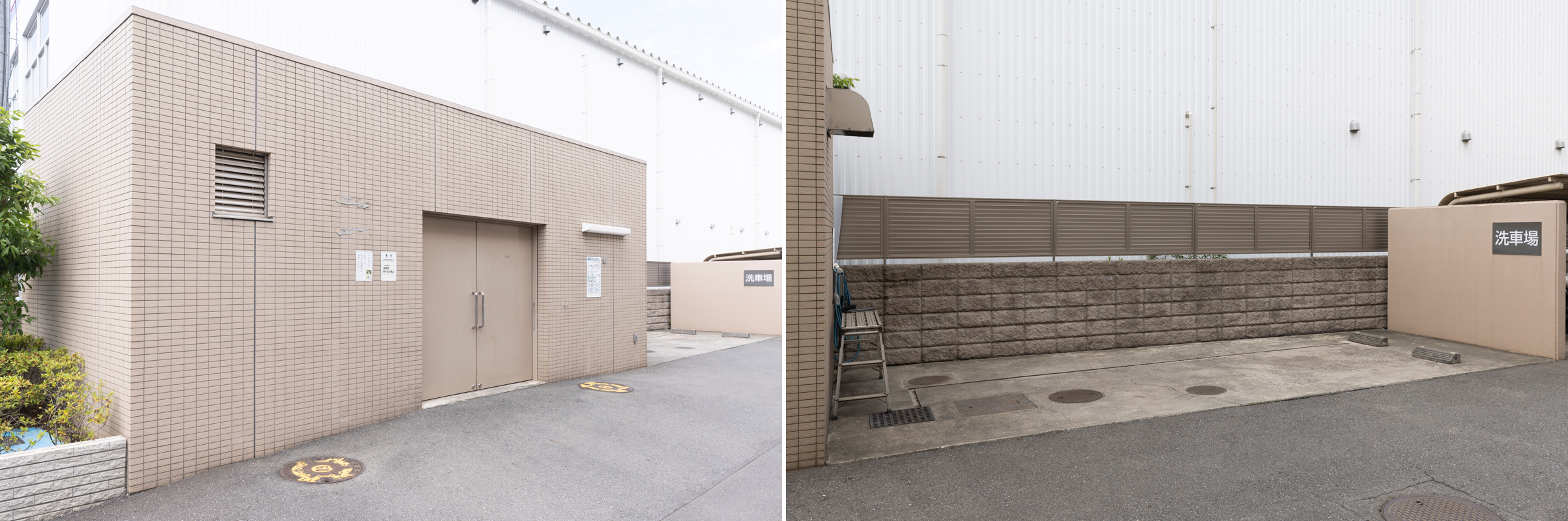 屋外のゴミ置き場は24時間ゴミ捨てOK。その隣には洗車スペースがあり、水道などが自由に使える