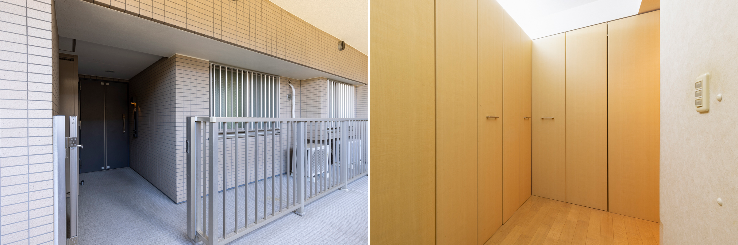 ポーチ付きの玄関前。中に入ると収納スペースがズラリと並ぶ