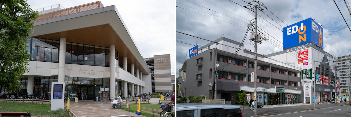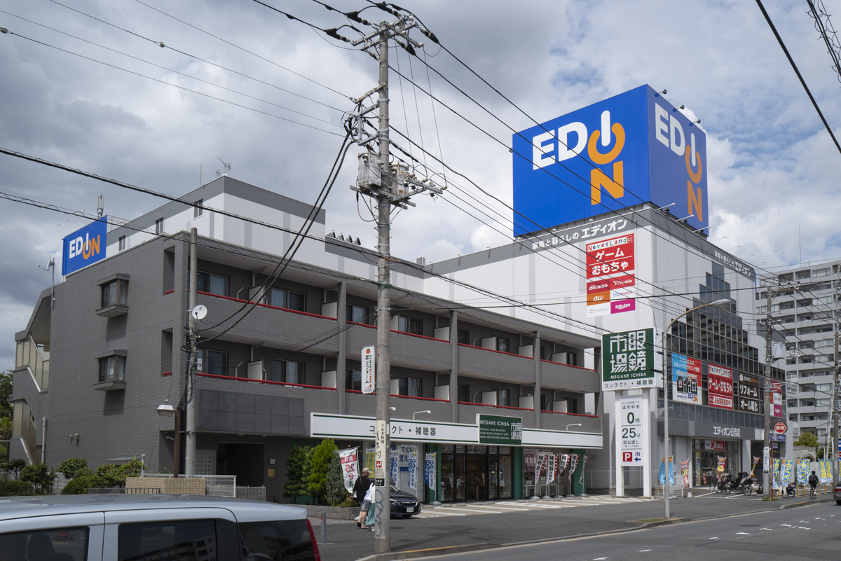 徒歩10分圏内のショッピングモールアピタ横浜綱島店。駐車場完備なので荷物が多い場合は車がおすすめ。アピタの近くにはエディオンもある
