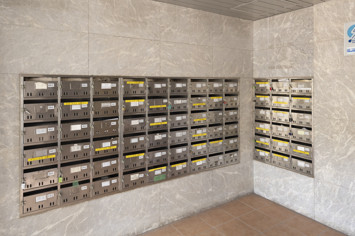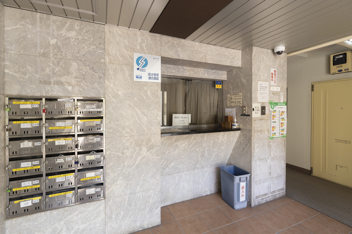 築年数の経ったマンションだが、修繕が施され新しさも感じられるエントランス