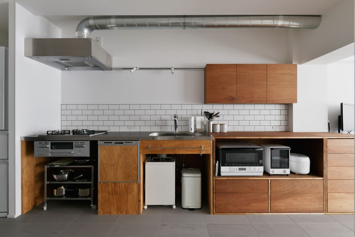 キッチンを使いやすい大きさにアップグレードしてみてはいかがでしょう。リノベなら好みのデザインで統一感を演出することができます。床材は写真のようなタイル張りもおしゃれで手入れがしやすくおすすめです。