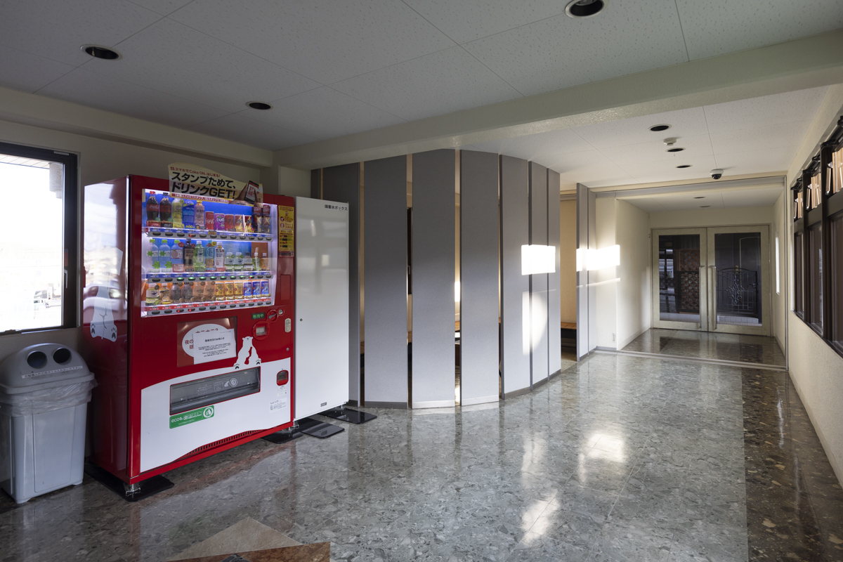 2階のエントランス。自動販売機と、共有の休憩場所が設置されている