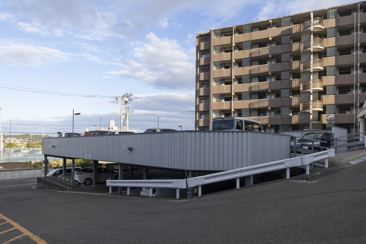 立体駐車場の近くに平置きの駐車場もある。2階のエントランスとほぼ同じ高さにあるので出入りしやすい