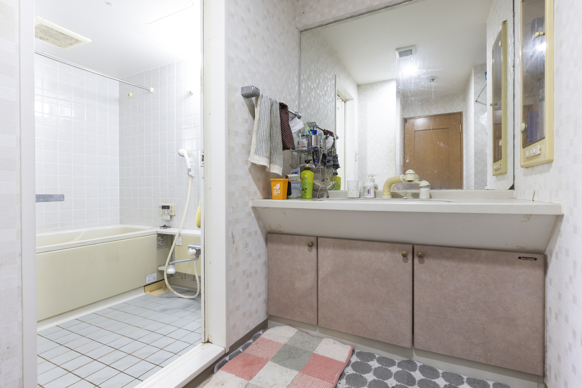 大きい鏡が特徴的な独立洗面台。浴室もキレイに保たれている