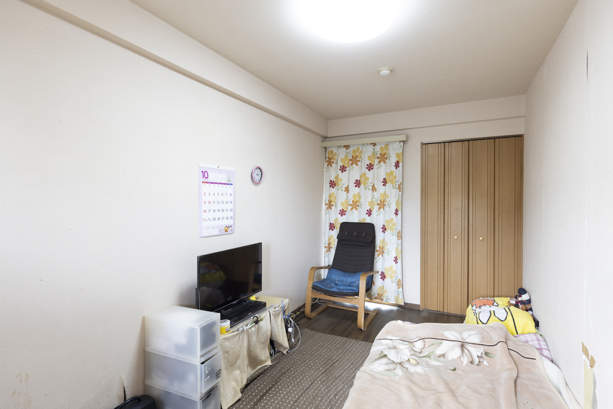 部屋をあえて仕切らず、廊下に続く先に寝具を置くエリアを作ることで、狭さを感じない空間にしています。奥まっていますが、窓があるので風通しは確保されていますし、洋室1との壁に室内窓を設置すれば、バルコニーからの日当たりや風通しも期待できます。