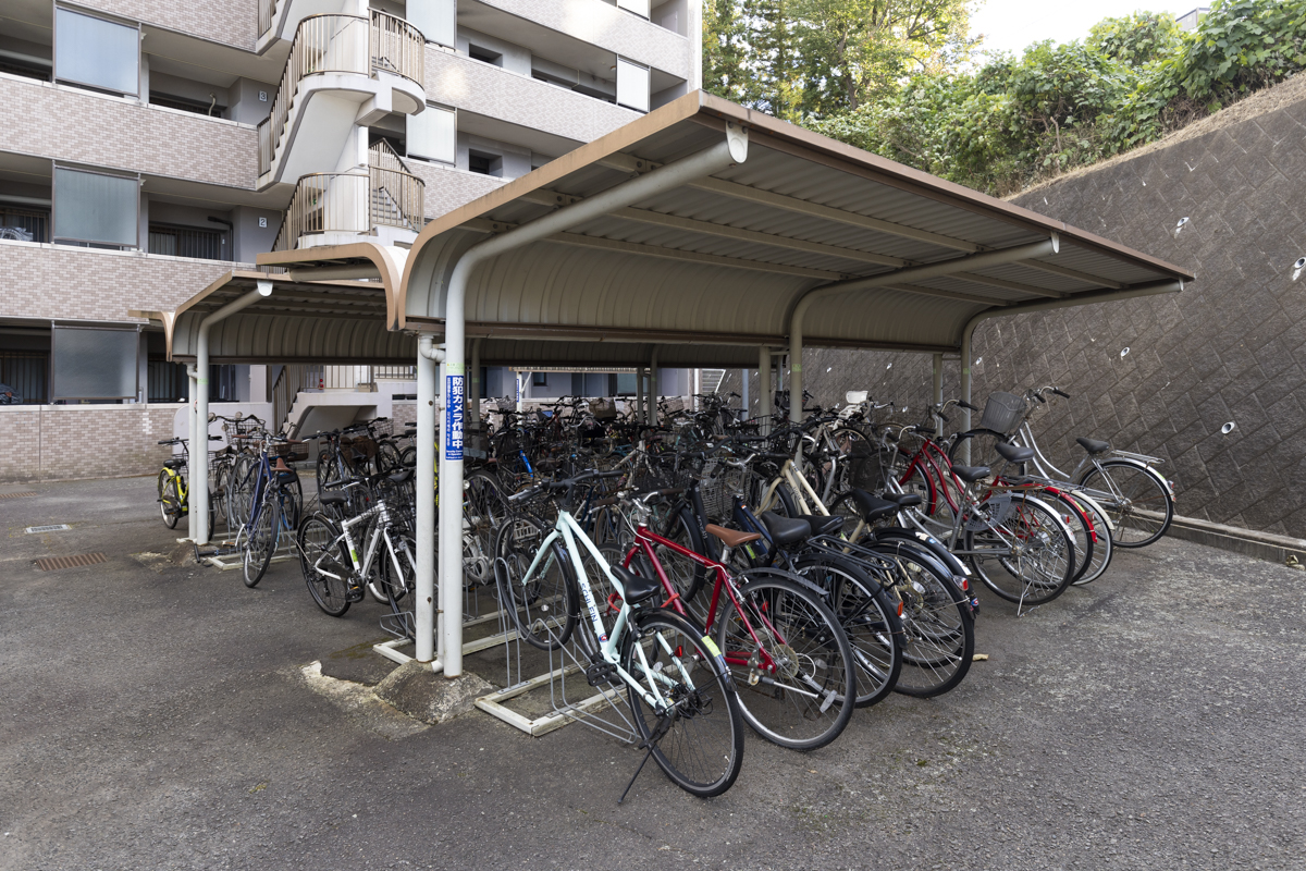敷地内の奥まったところに設置された駐輪場。世帯数に合わせて収容台数は多め