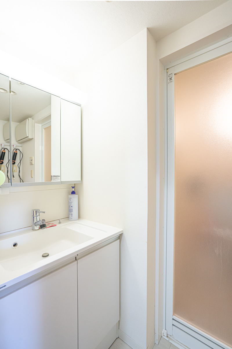 洗面室から洗面台を独立させて、洗面室を広くしています。洗面台をリビング内のオープンなスペースに設置することで、来客時の対応にも便利です。洗面台下の空間にペットの水飲み場やトイレを設けてもOKです。