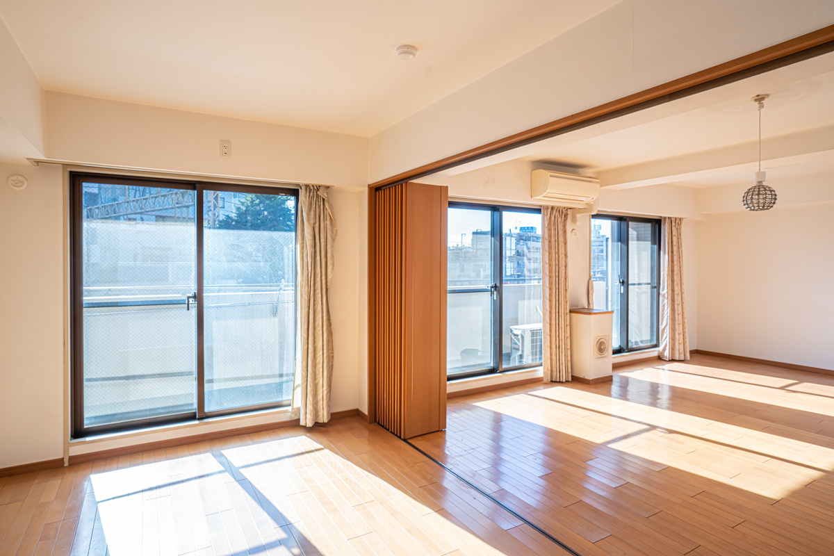 都心ならではの便利さを満喫しながら、一度部屋に入ってしまえば、青空を眺めながら静かな生活を送れる魅力的な物件です。バルコニーに3部屋が面している利点を最大限に生かして、お住まいの方に合わせた個性的なリノベーションができそうですよ。