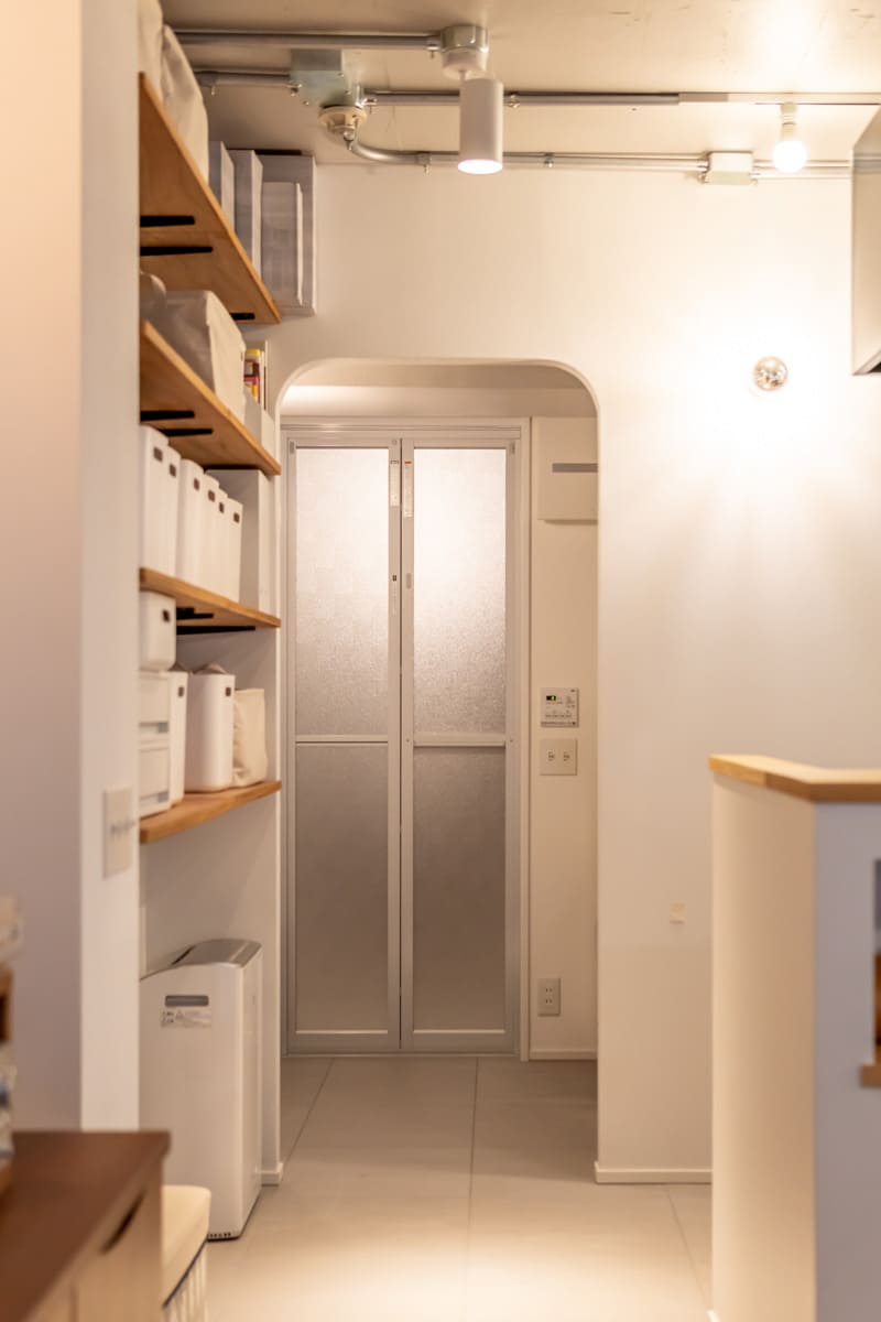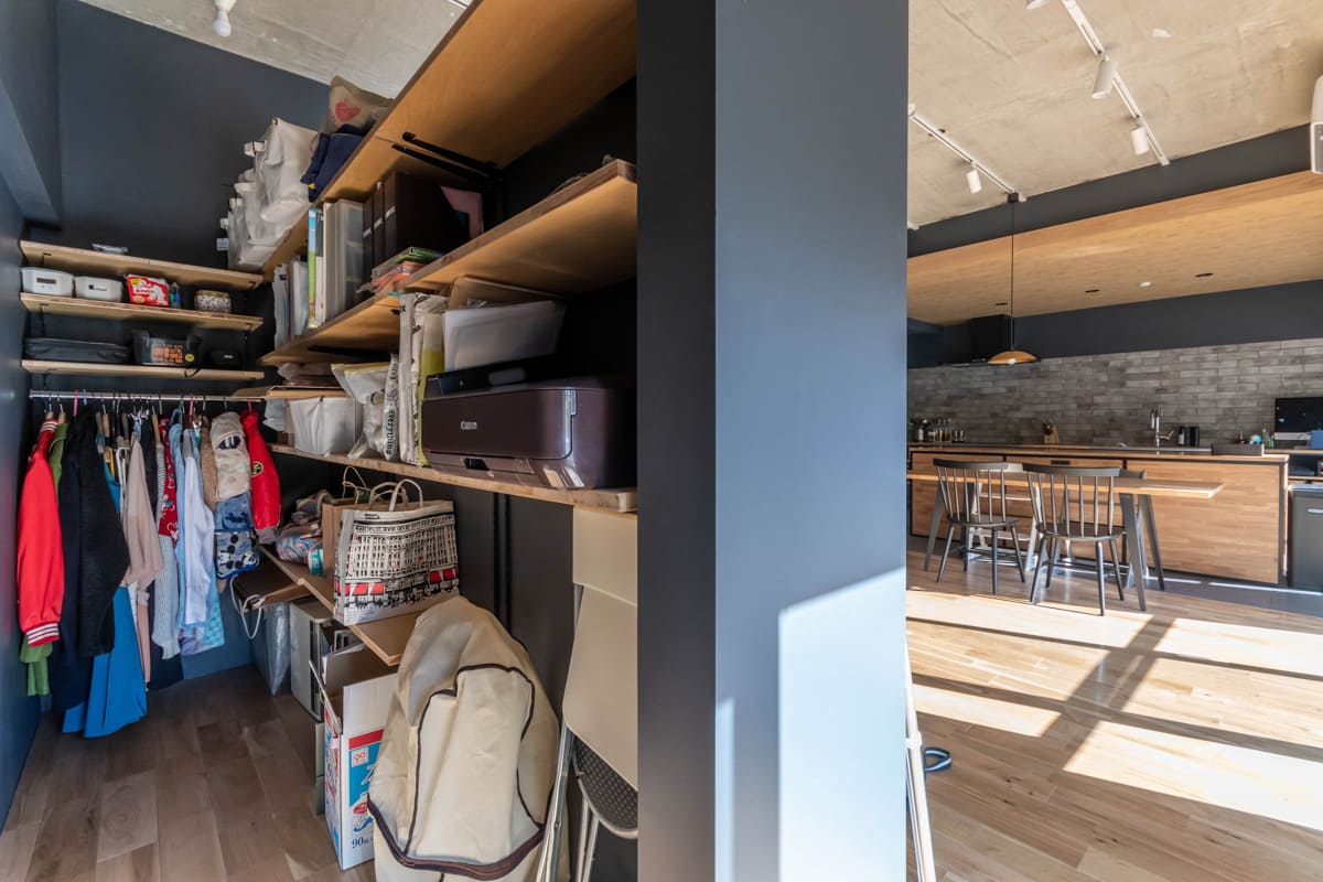 キッチンとつながり、リビングダイニングに向かう場所をウォークスルー型のパントリーに。リビング側に来客があっても死角になるので、オープン棚でも気になりません。気になる場合は入り口にカーテンをしいても良いでしょう。