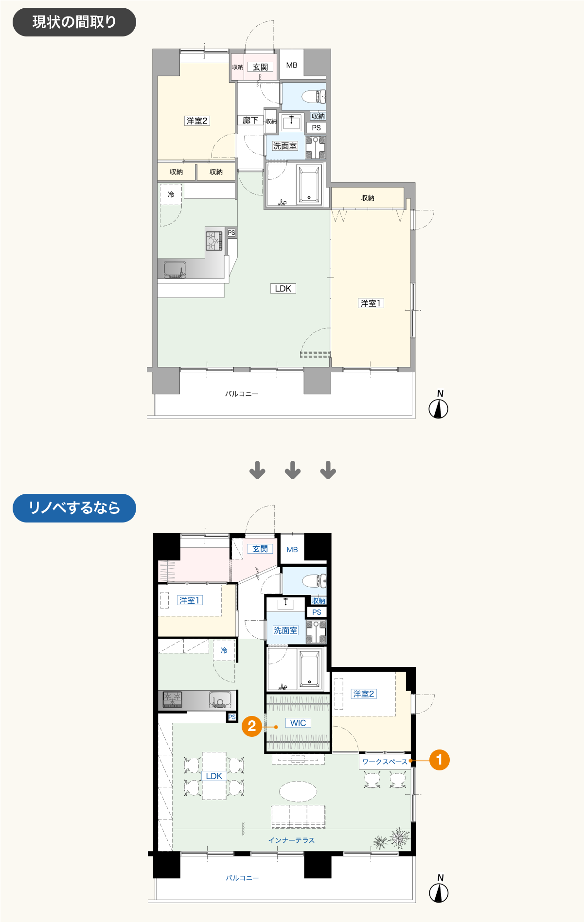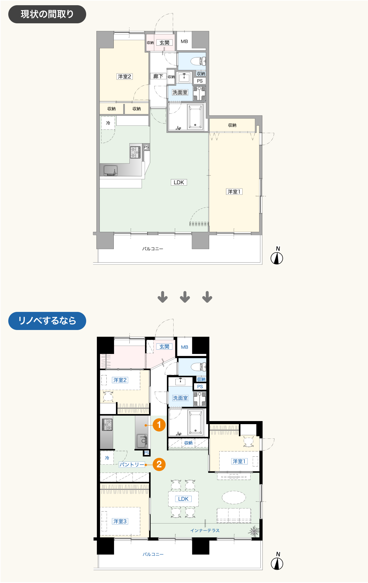 図面上、間取り変更しやすい構造のため、リノベーション向きの物件です。プロ目線で作成したファミリー向けのリノベーションプランを2つご紹介します。