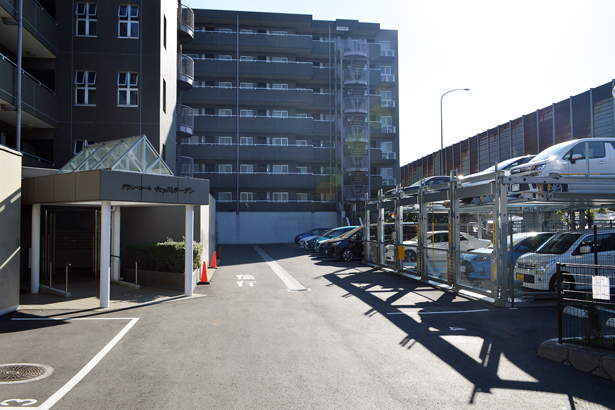 グラン・コート六ツ川ガーデンの駐車場マンションの前には平面駐車場と立体駐車場