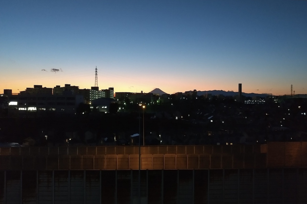 グラン・コート六ツ川の眺望天気の良い日には、玄関を出たところから富士山を眺めることができる。夕方がチャンス