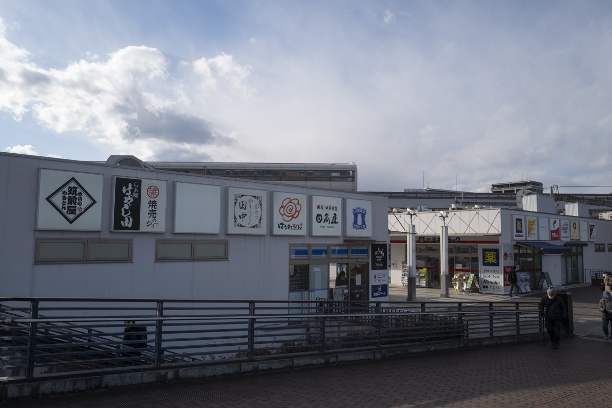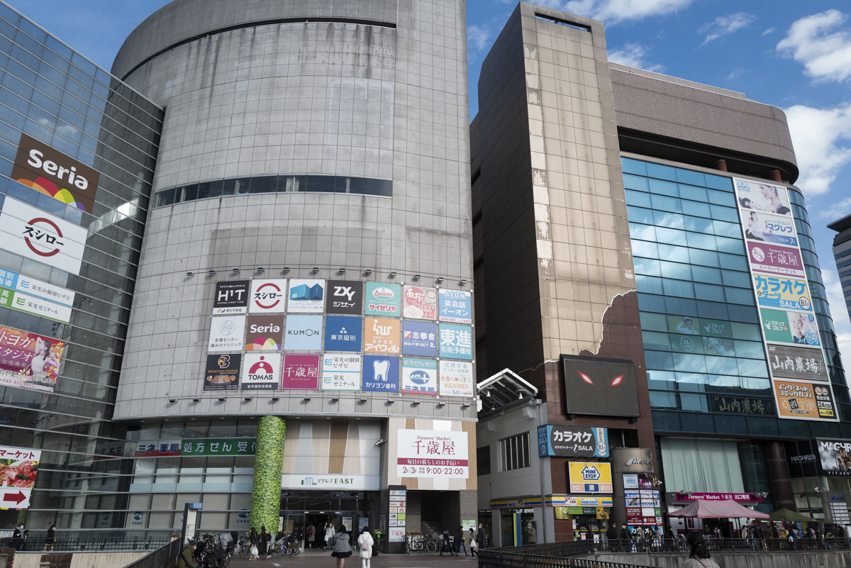 西口を出て左手にある複合施設マグレブEASTには、地元で人気のスーパー千歳屋や100円ショップ、飲食店などが軒を連ねる