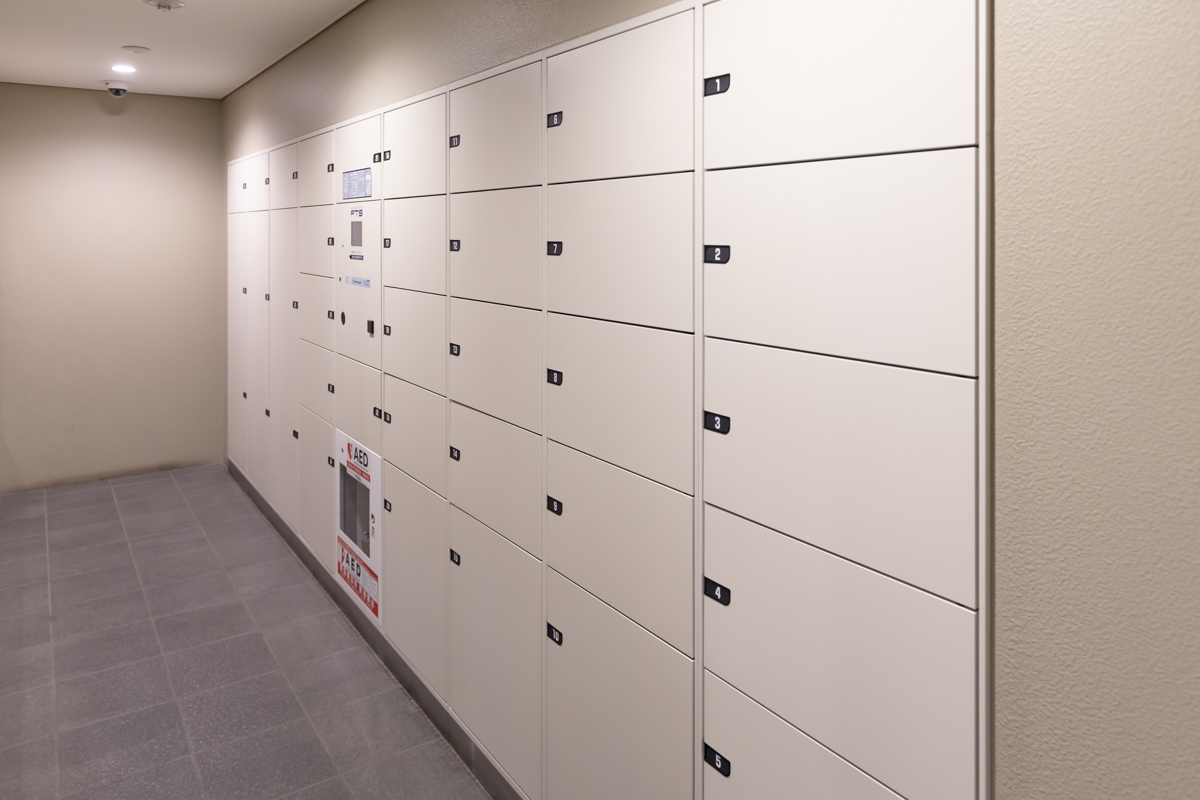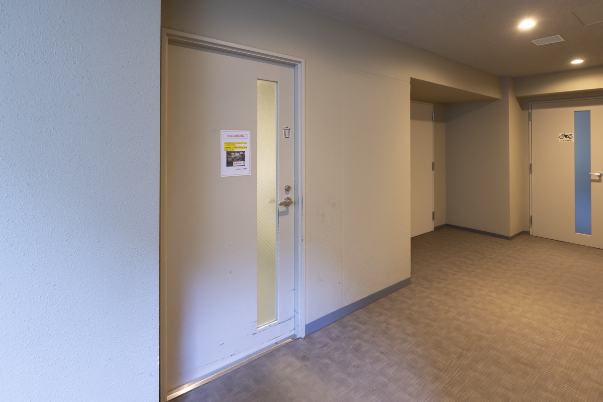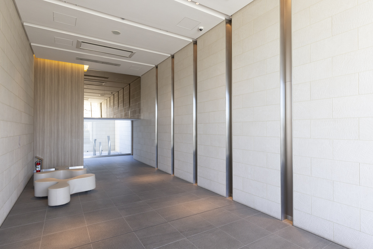 管理が非常に行き届いているとひと目で感じられるほどにきれいなマンション。入り口は道路側とペデストリアンデッキ側の2箇所用意されていて、ルートごとに使い分けが可能です。駐輪場、駐車場も完備で、ゴミ出しはいつでもOK。カフェやスタディルームといった共用施設があるのも、このマンションの大きな特徴です。