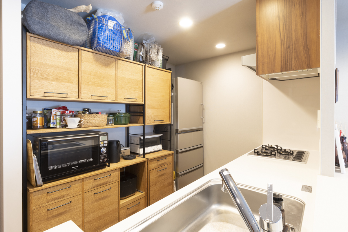 広い空間を利用して、パントリーを設置するのはいかがでしょう? 回遊性のあるパントリーがあると、家事動線がよく食材の管理もしやすいです。また、冷蔵庫をパントリー内に配置すれば、生活感のないLDKがつくりやすくなります。