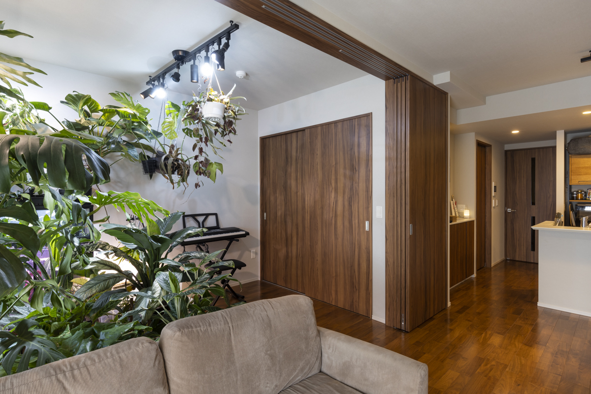 LDKは現状を活かしつつ、一部をインナーテラスにするプラン。ゆとりのある空間の演出と、趣味やくつろげる場所を確保しています。玄関周りは広く取り、WIC→洗面室に回遊動線をつくることで、日々の着替えや身支度で部屋が散らかりにくく整理整頓がしやすいようになっています。家族それぞれが散らかさない工夫を散りばめることで、楽にきれいな生活空間が保ちやすくできます。