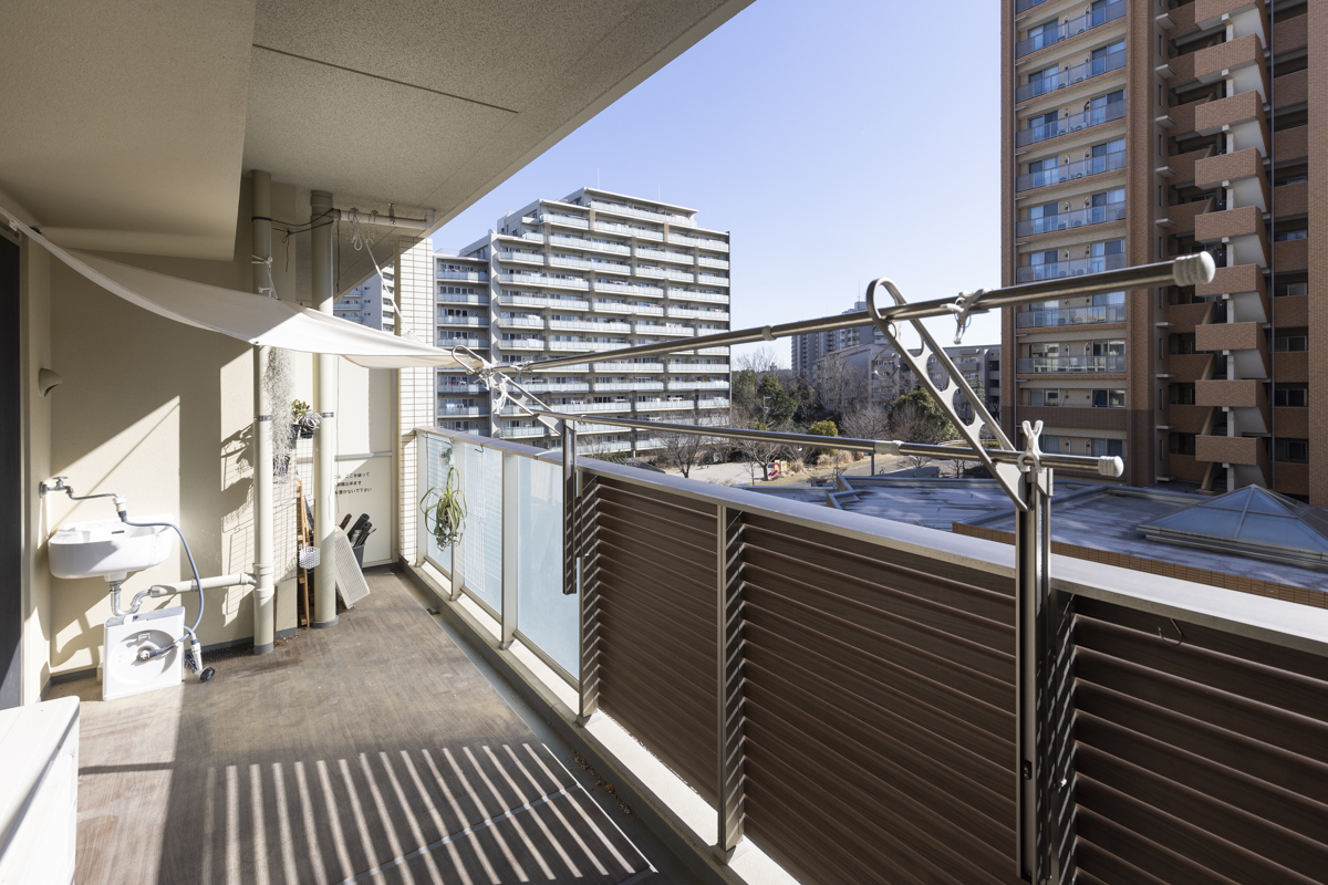 奥行きがあっていろんなことに使えそうなバルコニー。シンクがあるのでグリーンを育てる場所としても良さそう