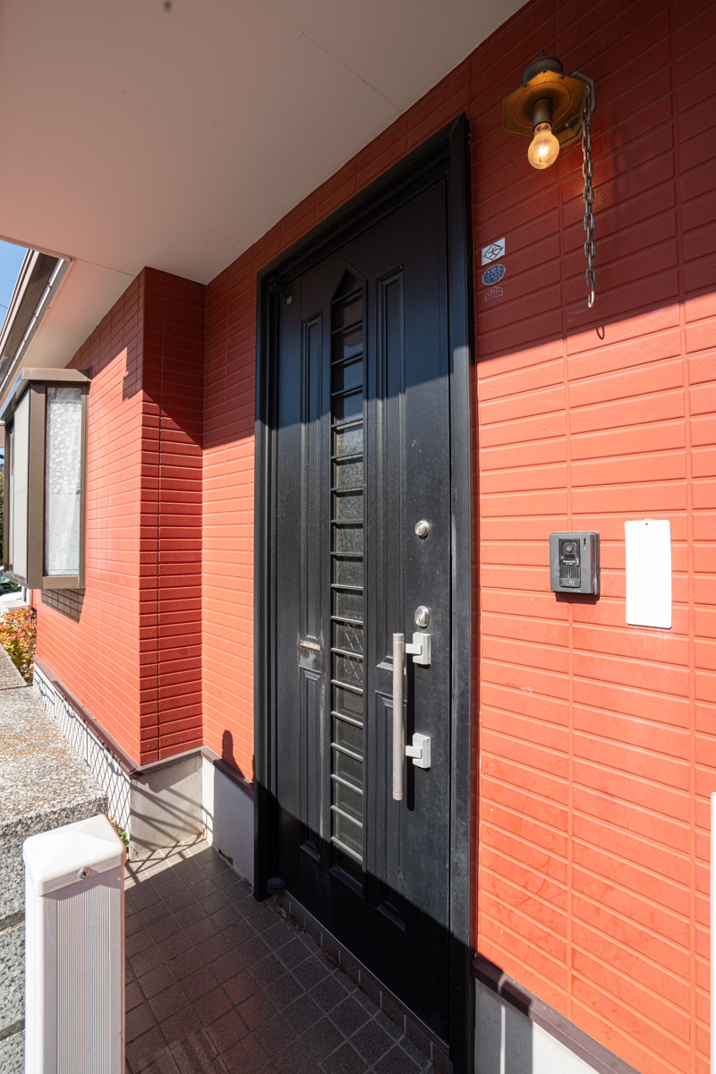 玄関ドアにも南からの明るい日差しが差し込んでいる