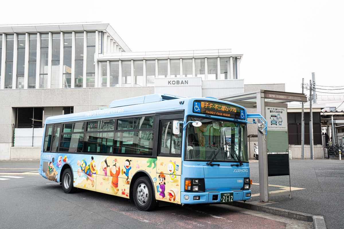 ミュージアム行の直行バスも、キャラクターが描かれた可愛いラッピングバスなんです。このあたりでは、ドラえもんミュージアムと生田緑地にある岡本太郎美術館が有名です。