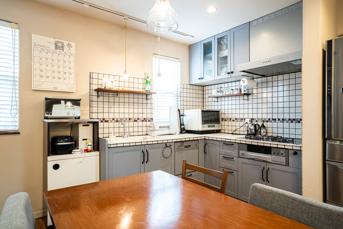 キッチンボードの色合いもブルーグレーで、雰囲気が出ています!