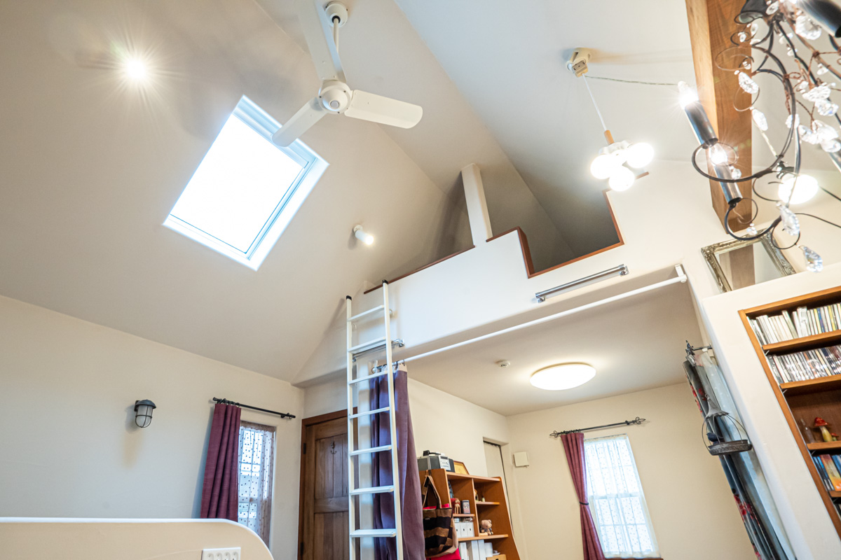 天窓のおかげで日中は照明なしでも明るい。ロフトの中は見えにくいのでいい収納場所として使える