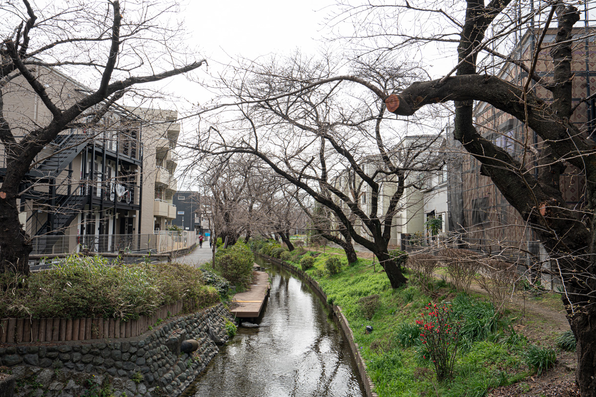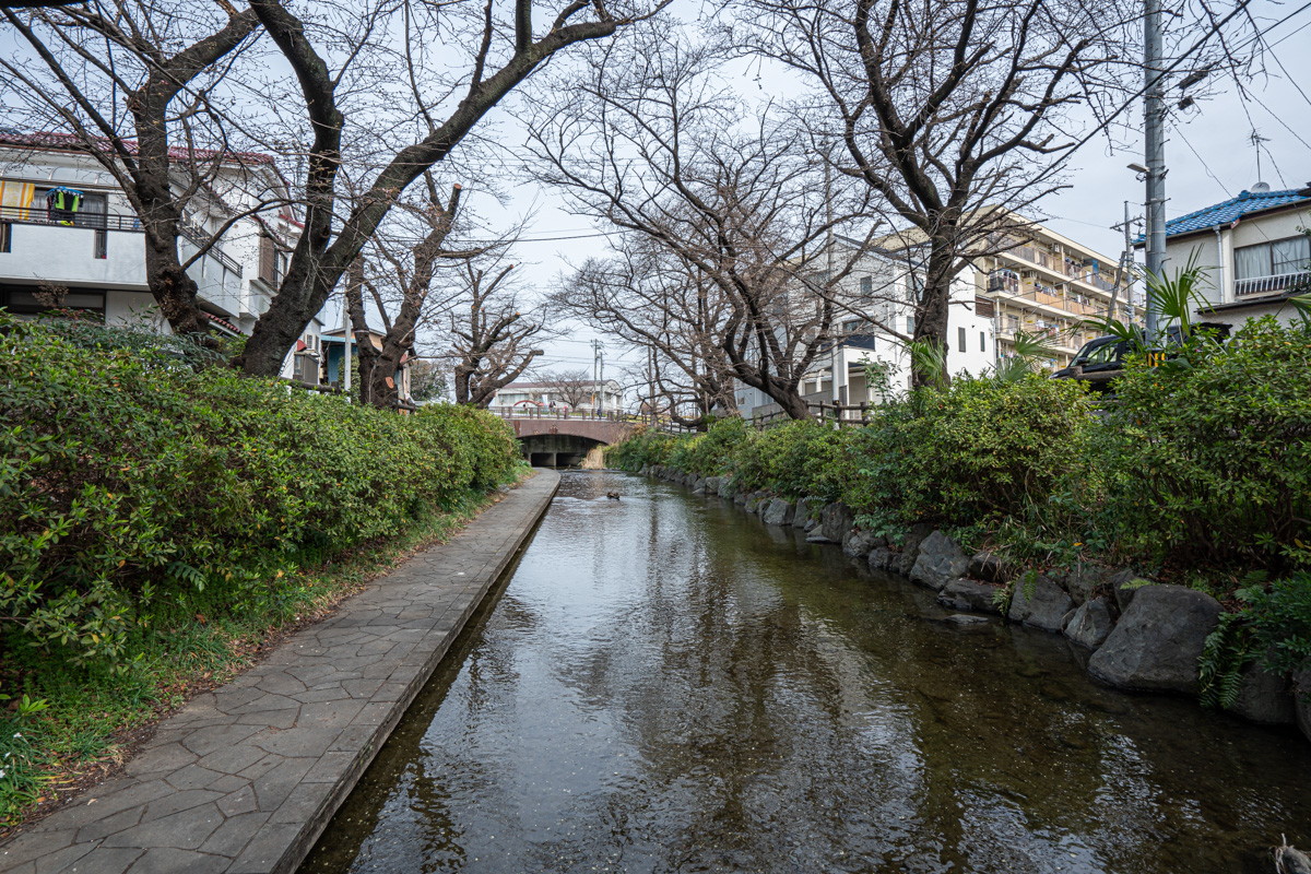 二ヶ領用水路ですね。春には桜がとてもきれいです。昔は田んぼが多い場所だったんでしょうね。最寄りの学校が「稲田中学校」というくらいですから(笑)。