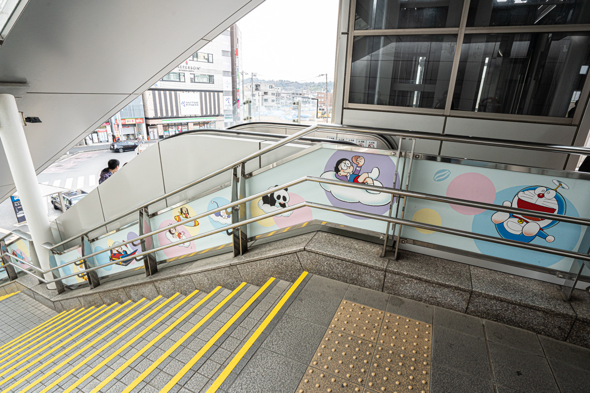 「川崎市 藤子・F・不二雄ミュージアム」の最寄り駅でもある登戸駅。電車を降りると、ドラえもんとその仲間たちがあちこちで出迎えてくれました。