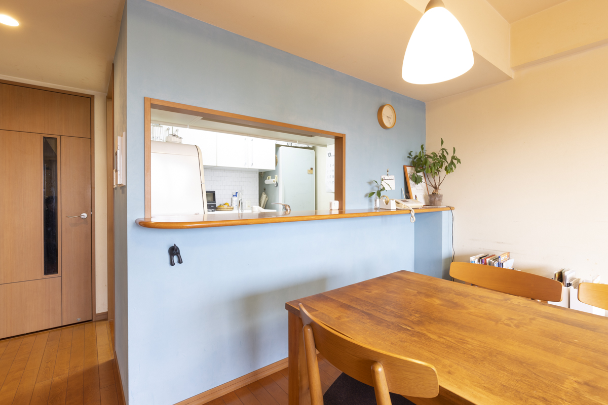 カウンターキッチンの壁は売主さんが子どもと塗ったもの。色合いがよく部屋のアクセントにもなっている