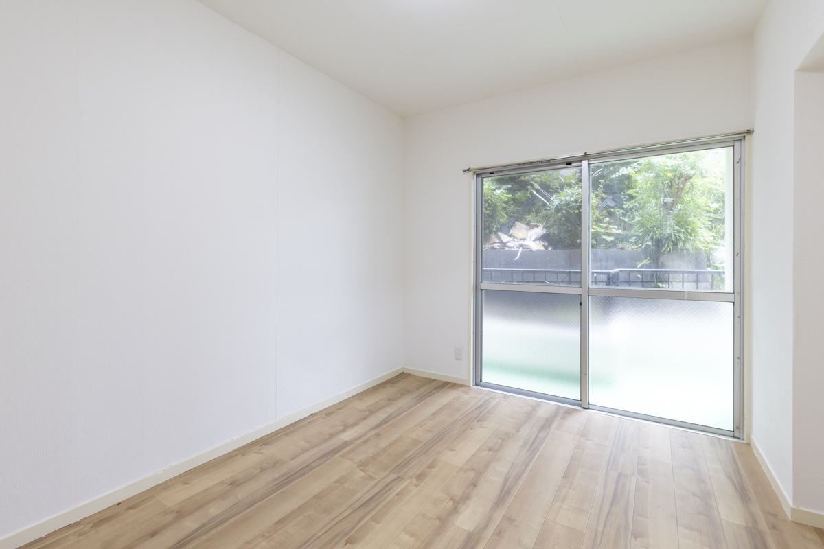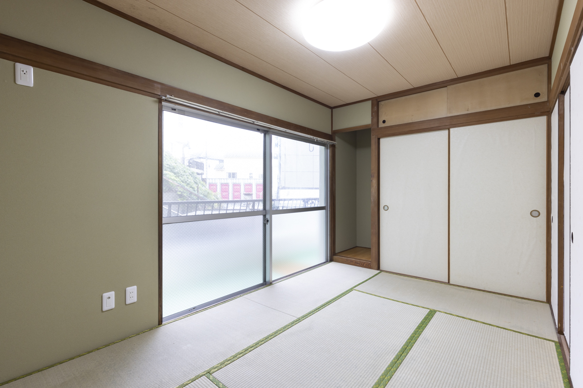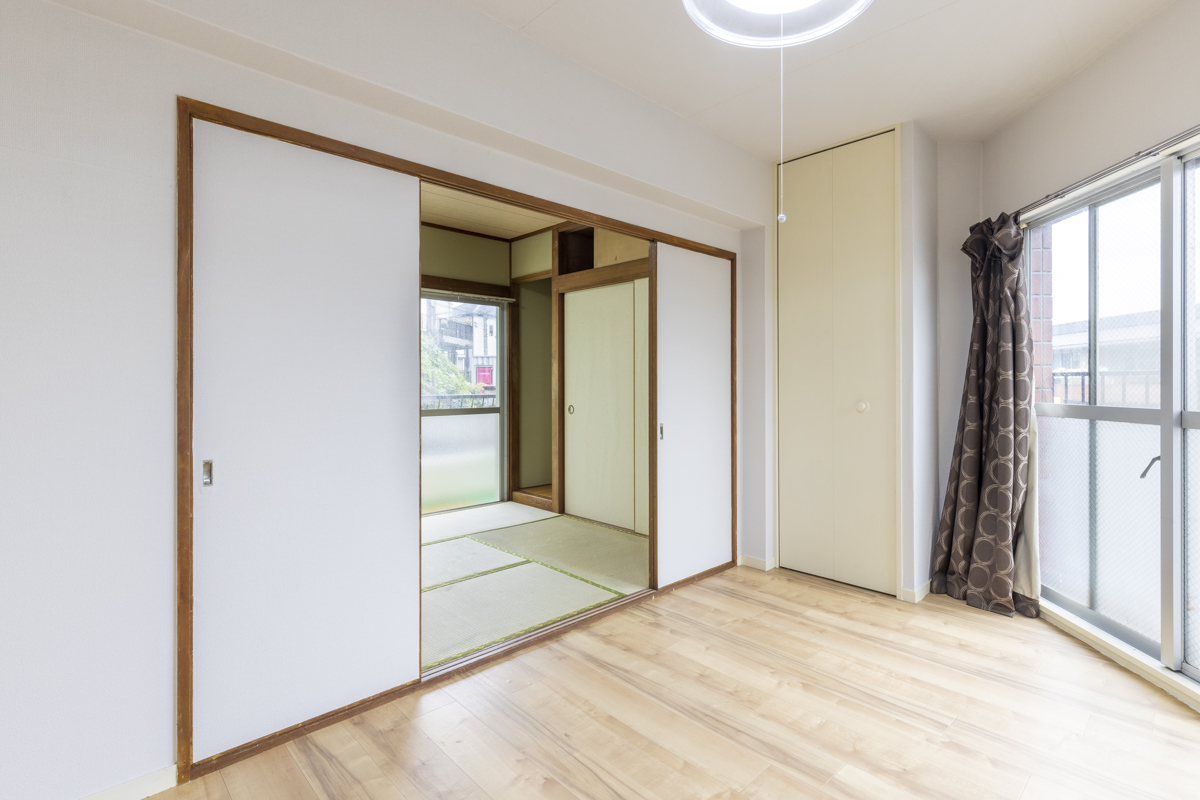 壁紙、フローリング、畳、窓ガラスが新しくされていて、消耗感の少ないお部屋。この日はあいにくの雨模様だったものの、採光がしっかり取れて反射し、明るい空間をつくり出していました。